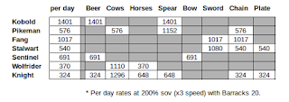 Initially, we concluded that the 6-food, 27000 population Knob Creek was overbuilt, and would therefore quickly lose population. To accelerate building implosion due to negative food, t1 cavalry clearing waves were scheduled at +14, +16, +18, +20, +24, +26 hours from siege landing. Sieges take 12 hours to set up and start firing, so the clearing waves started arriving at 2 hours after bombardment started. In addition to taking food, a clearing wave will also remove building materials that can be used to prestige build structures, a technique used to keep the city above raze population (25% original population) and prolong the siege.