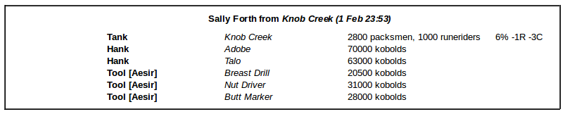 At 01 Feb 23:53, the city of Knob Creek launched a Sally Forth maneuver against the SIN-300 siege. The attackers lost 33% of their army (about 70000 kobolds), causing only 6% damage in the exchange. As the attack was almost completely composed of kobolds, it was very unlikely to succeed against an entrenched defensive force of bows, kobolds, and halbardiers.