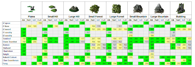 Remember, the point of the chart is to compare various armies. In every battle, there is an attacker, a defender, and a terrain. All battles are relative. Smashing a gray attacker into a red defender can be way more effective than a green vs. green battle where nobody has an advantage.