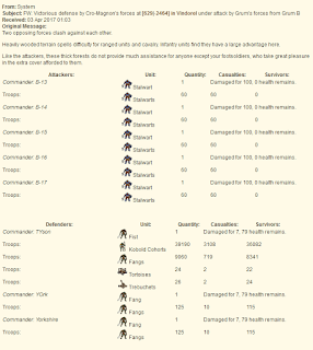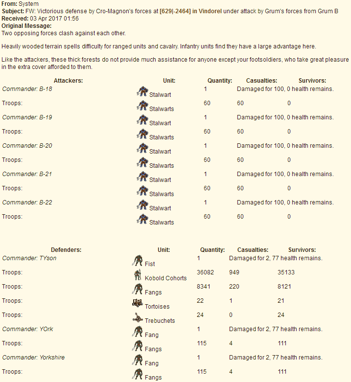The fortress of Grum B is completely surrounded by large forests. For those new to Illyriad PvP, this is a very significant placement. The favored dwarven racial unit is stalwarts, the best infantry attacker in the game. Infantry receives a +30% bonus when attacking any forest. Treggar did match the defender to the attacker--aside from orcish kobolds, the t1 bow units are the best general-purpose anti-sword defenders in the game. Bows suffer a -20% defensive penalty in large forest.