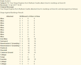 Treggar has taken the opportunity to run some direct siege attacks through Grum B. The reports below show that Grum's wall was damaged and then quickly repaired to full capacity. Direct catapult attacks have also inflicted some damage that was rapidly fixed. Prestige building is one of the challenges to any siege warfare. If the siege camp itself cannot be held due to poor terrain, then the opponents are often reduced to using the siege train tactic to cause building damage. Siege trains suffer from many drawbacks. In the Thunderdome situation, it is hard to inflict any permanent damage on an opponent who is willing to prestige build, unless the attacker can also hold a blockade or siege on the target city. Every attempt to use a siege train can result in mistakes that result in losing all siege engines. The defender will boost runes using the Runemasters Grounding buildings, or equip defenders to cause severe casualties, or get friendly reinforcements (in non-Thunderdome fighting, of course).